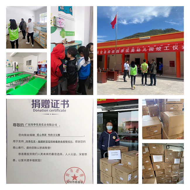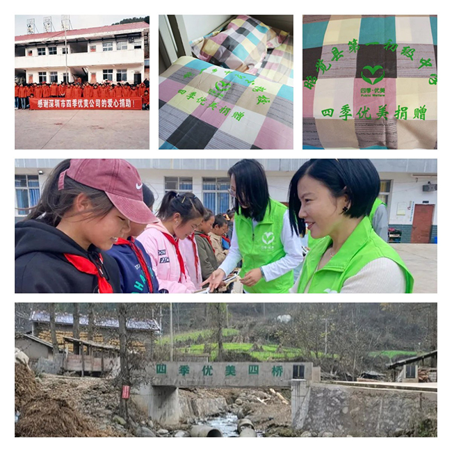 賑災(zāi)捐款,參與健康類公益救助項(xiàng)目,捐建校舍、橋梁,改造校園設(shè)施等,檢驗(yàn)著四季優(yōu)美投身公益活動(dòng)的成色。深圳關(guān)愛行動(dòng)“十佳愛心企業(yè)”提名獎(jiǎng)的殊榮,是對(duì)四季優(yōu)美長期堅(jiān)持公益的肯定。而逐年推進(jìn)的“暖冬”活動(dòng)及“一加一”資助行動(dòng),更已成為具有四季優(yōu)美文化內(nèi)涵的公益品牌。
